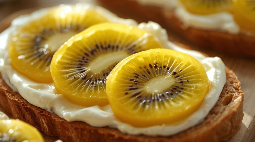 🍞 En tostadas saludables: kiwi amarillo sobre pan integral con ricotta o crema de almendra.